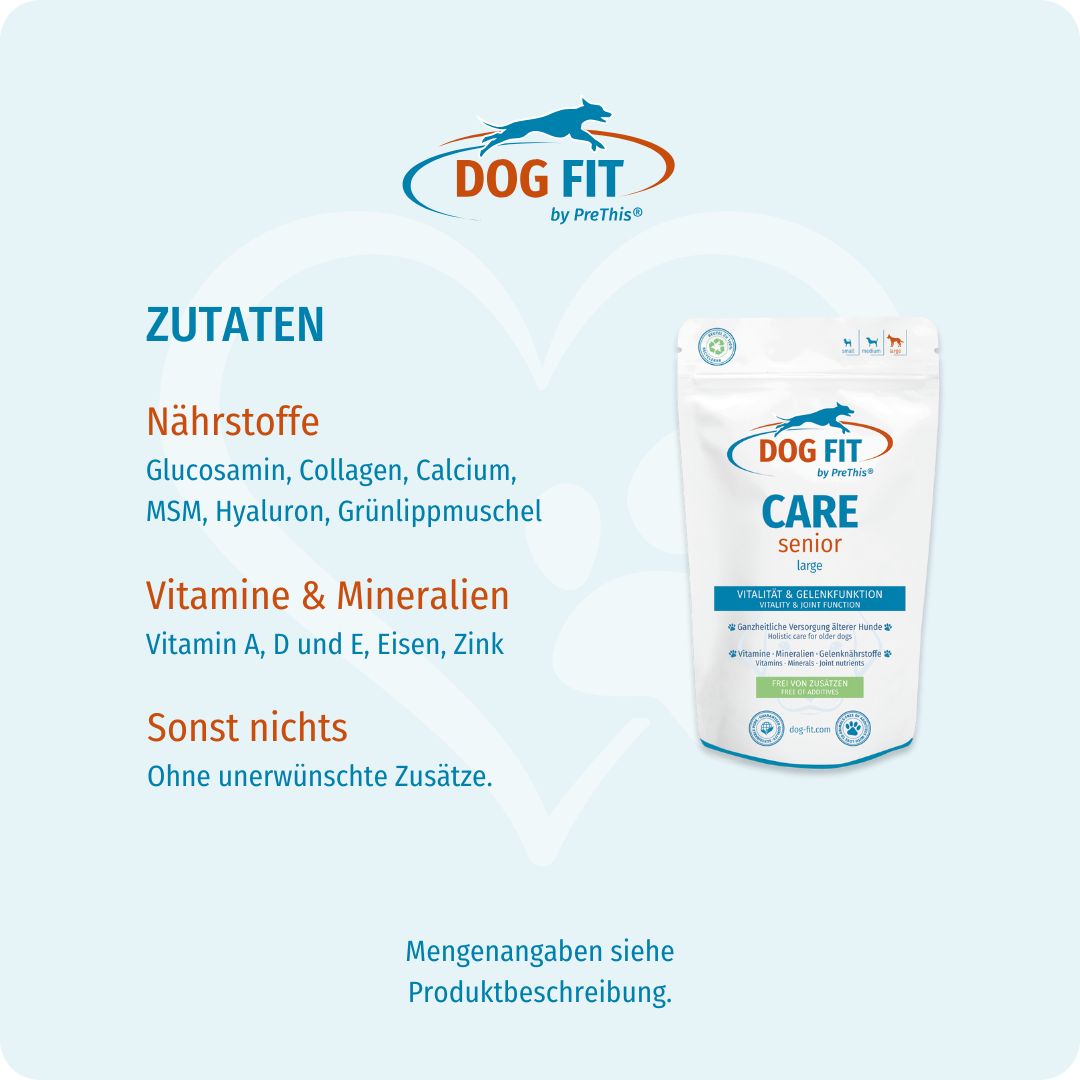 DOG FIT Hund CARE senior kombiniert u. a. MSM, Collagen, Glucosamin, Calcium, Hyaluronsäure, Grünlippmuschel, Eisen, Zink sowie die Vitamine A, D und E.